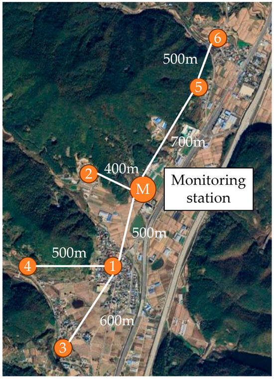 The study area was selected among several candidate sites based on the number of farms and the number of cattle raised. The selected area is characterized by a basin surrounded by forests, with villages formed at lower altitudes below the basin, comprising 403 farms with a total of 9510 cattle. We chose this livestock-farming area with minimal influence from industrial or vehicular emissions to better understand the contribution of ammonia to PM formation and evaluate the performance of air dispersion models in conjunction with deep learning techniques. To measure PM concentrations, a total of seven monitoring stations have been installed. As shown in Figure 1, the central station is located as the main monitoring site, and four out of six auxiliary stations are arranged along the village in a north-south direction, while the remaining two are positioned in valley areas to the west of the village. From the seven measurement stations in the study area, 3 km vertically and 2.4 km horizontally, a total of 600 data points were collected at one-second intervals from 5 July 2023, 00:00 to 31 July 2023, 23:00. Measurements included PM2.5 concentration, temperature, humidity, and air pressure. To visualize the data as images, the study area was organized into a grid structure with grid points placed at 200 m intervals, forming a 15 by 12 matrix, and the recorded values were then assigned to the corresponding monitoring stations.