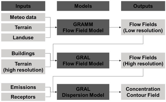 The air dispersion model aims to analyze the pollution impact on the air quality in surrounding areas, known as receptors, by simulating the dispersion, movement, and chemical reactions of air pollutants emitted into the atmosphere [23,24]. Given the valley-shaped terrain surrounded by mountains in the study area, we opted to utilize the GRAL (Graz Lagrangian) model for air dispersion modeling to replicate PM2.5 concentrations within this region [25]. The GRAL model is an atmospheric dispersion model developed and validated by the Institute for Internal Combustion Engines and Thermodynamics at Graz University of Technology in Austria, suitable for modeling in complex terrains such as valleys and basins, as seen in mountainous regions like the Alps [26]. It used meteorological data, terrain data, and emission data as input data. The meteorological data utilized measurements from monitoring stations installed in the study area, from which the meteorological fields during the modeling period were generated. The initial meteorological fields were then refined by incorporating nearby automatic weather system (AWS) data. The terrain data included digital elevation models, land use, and building data. The digital elevation models and building data were obtained from the National Spatial Data Infrastructure (NSDI) Open Market provided by the Ministry of Land, Infrastructure and Transport in Korea (https://www.data.go.kr/en/tcs/eds/selectCoreDataView.do?coreDataInsttCode=1613000&coreDataSn=1; accessed on 2 September 2024). The land use data utilized detailed land use information provided by the Ministry of Environment in Korea, and the emission inventory data utilized grid-based emission data (1 km resolution) provided by the National Air Emission Inventory and Research Center of the Ministry of Environment (https://www.air.go.kr/main.do; accessed on 2 September 2024). All input data were reprocessed using the GIS program QGIS to fit the GRAL modeling program. An intermediate-scale weather model integrated within GRAL simulated the spread of PM2.5 concentrations in the study area by integrating the meteorological fields with PM2.5 emissions data specific to the region. Figure 3 depicts the outline of the dispersion modeling employed in this study.