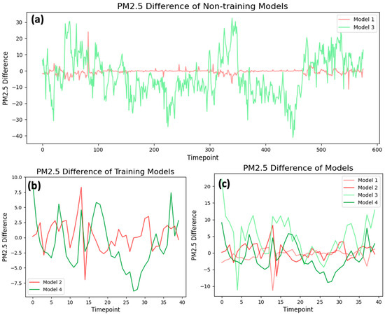 Temporal patterns of prediction errors across the models. (a) Difference of PM2.5 prediction models without training across the entire temporal range (b) Difference of PM2.5 prediction models with training in the test temporal range (c) Difference of all PM2.5 models in the test temporal range.