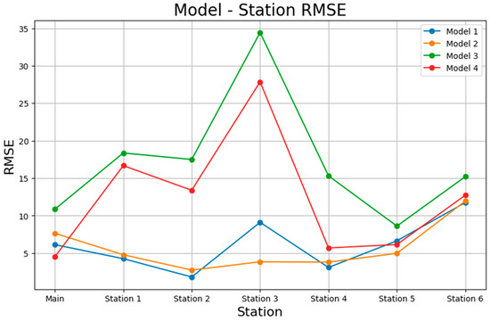 Figure 6 presents the PM2.5 prediction performance of the models across monitoring stations, evaluated using root mean square error (RMSE). Models 1 and 2 rely on observational data, while Models 3 and 4 are based on predictions from the atmospheric dispersion model. Consequently, Models 3 and 4 exhibit higher RMSE values compared to Models 1 and 2 when benchmarked against observed data. This discrepancy highlights limitations in the atmospheric dispersion model, particularly its incomplete representation of local characteristics and external influences, which can significantly affect prediction accuracy. Model 3, the emission-based air dispersion model, generally underperformed relative to Model 1, the spatial interpolation model using kriging, across all stations. However, the performance gap narrowed in regions with fewer monitoring points, such as Stations 5 and 6. This trend suggests that, while spatial interpolation techniques like kriging excel in densely monitored areas, they may be less effective in sparsely monitored regions where the physical principles of pollutant dispersion used in the air dispersion model become more relevant.