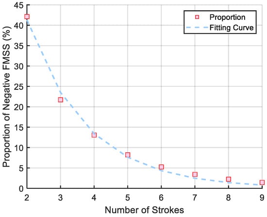 The distribution of the proportion of negative FMSS with different numbers of strokes is shown in Figure 1; the blue curve represents the exponential fitting proportion distribution function. The expression is as follows: where represents the proportion of negative FMSS with different numbers of strokes, represents the number of strokes. Through distribution fitting, is found to be 127.20, and is 0.56, it can fit the variation characteristics of the probability with the multiplicity well. The proportion of negative FMSS decreases exponentially with an increase in the number of strokes, with a significant proportion for 2 strokes, and the proportion of negative FMSS with more than 6 strokes does not exceed 10% of the total number of negative FMSS.