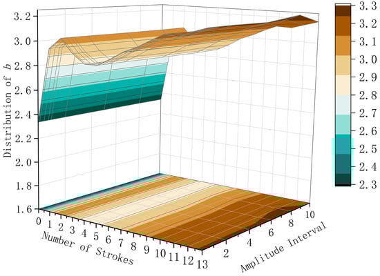 The distribution characteristics of the b value for multiple subsequent strokes across different amplitude intervals are presented in Figure 3. b, Although experiencing minor decreases, there were overall trends to increase with the number of subsequent strokes, ranging between 2.86183 and 3.24934. The change in b from the subsequent strokes 1 to 7 in each multiple subsequent strokes across different amplitude intervals is very small, remaining essentially constant. The subsequent strokes 12 and 13 at an amplitude interval of 8 see a larger increase in b compared to others, while the subsequent strokes 8 to 13 at an amplitude interval of 10 see a larger decrease. The changes in b for each subsequent stroke across other amplitude intervals are minimal, staying essentially constant; in the amplitude interval data from 0.1 to 10, the pattern of change in b from the first return stroke to the subsequent stroke 13 is consistent, with the largest increase in b occurring after the subsequent stroke 1. After the subsequent strokes 1 to 2, the b continues to rise, then decreases to a trough, and starts to increase continuously after the subsequent stroke 6, reaching its maximum value at the subsequent stroke 13. The maximum b occurs at the subsequent stroke 13 within an amplitude interval of 8, with a maximum b of 3.24934, while the minimum b occurs during the first return stroke at an amplitude interval of 0.1, with a minimum b of 2.86183.