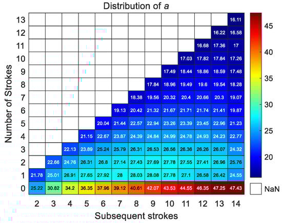 The characteristics of a across different stroke numbers are depicted in Figure 4, showing a slow increase in a of the first return stroke with an increase in the number of strokes, indicating a positive correlation with the number of strokes. The maximum a is 47.43 , occurring in the first return stroke with 13th subsequent strokes; the minimum a is 16.11 , occurring in the subsequent stroke 13 of lightning with 13th subsequent strokes. The distribution of a in subsequent strokes generally increases slowly and then decreases with an increase in the number of subsequent strokes. For each lightning stroke, the value gradually decreases with an increase in the number of strokes, showing a negative correlation with the number of strokes.