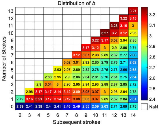 The distribution characteristics of the b for multiple subsequent strokes are illustrated in Figure 5, showing a similar trend across different lightning strokes, with the b first increasing, then decreasing, and finally increasing again with an increase in the number of strokes. At the same stroke sequence, b generally shows a trend of first increasing and then decreasing with an increase in the total number of strokes. b ranges from 2.39 to 3.27, the subsequent stroke 11 with 11th subsequent strokes having the maximum value, and the first return stroke with 2nd subsequent strokes having the minimum value.