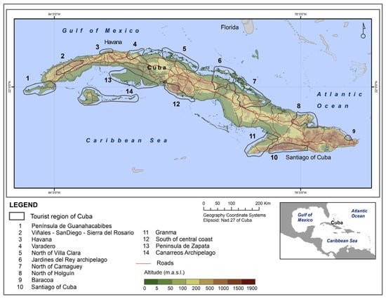 The area covered by this research is the tourist region of the Americas [], the Caribbean subregion, specifically 14 special areas in the Cuban archipelago (Figure 1) identified as priority regions for current and future tourism development in the Cuban Ministry of Tourism’s Tourism Development Strategy for 2030 [].