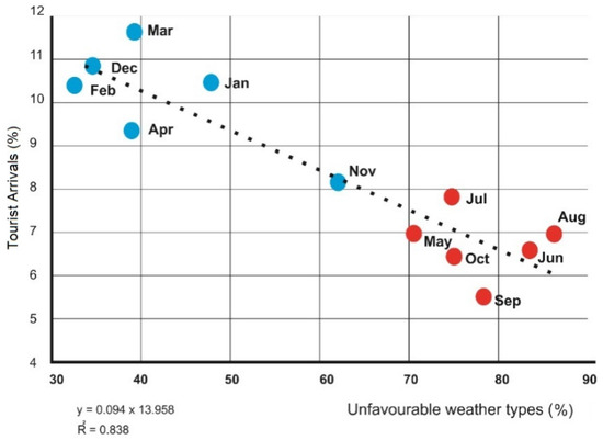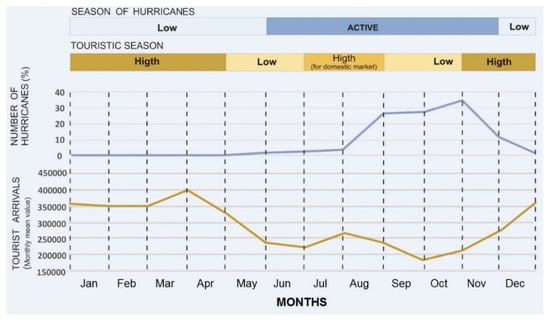 Monthly data on tourist arrivals on the island in 2019 [] revealed that 39.5% of total visitors to Cuba arrived in the low season, while the remaining 60.5% visited in the high season. The lowest percentage of visitors, from May to October, is closely associated with the weather conditions, which are incompatible with leisure and recreational activities (Figure 3) and, above all, to severe hydrometeorological phenomena, especially hurricanes. The hurricane season in the Atlantic basin, the Caribbean Sea, and the Gulf of Mexico is defined as June to November. November records 8.1% of the total number of annual visitors despite being characterized by cold fronts and tropical cyclones (it is also the last month of the active hurricane season).