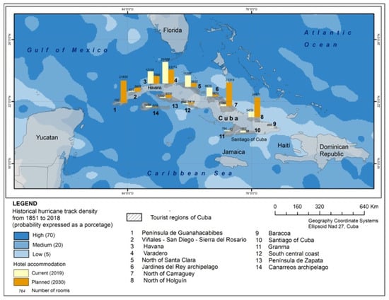 This study focuses on the relationship between hotel sites (current and planned) and exposure to hurricanes in Cuba. The hypothesis focused on demonstrating that Cuban tourist areas have differing degrees of exposure to tropical cyclones according to the month. The results indicate that although the whole Cuban archipelago is exposed to hurricanes, the tourist regions in Cuba’s western provinces have a greater chance of being affected than those located in the center, east, and south. The tourism development that will take place by 2030 in Cuba includes significant hotel expansion in coastal areas that are highly exposed to hurricanes. Information on the risk of hurricanes in tourist regions provides information that could enable the creation of the organizational conditions needed to tackle these phenomena in the short to medium term and to refine spatial and tourism planning approaches in the long term.