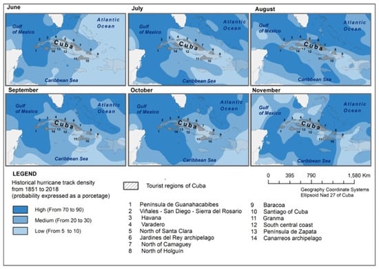 The individual analysis for each month of the hurricane season (Figure 6) strengthened the case for the above-mentioned approach since tourist regions in western Cuba continue to be the most exposed to hurricanes during most months. However, this general behavior does not apply to all months. Such is the case in August and November, when the areas that have been hardest hit in the past are the north coast of western and central Cuba and the provinces of the easternmost tip, respectively.