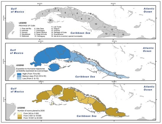 The third limitation is related to the working scale; although the scale used provided an overview at the regional level, it did not consider the differences in Cuba’s tourist regions with respect to the relief, type of shoreline, and coastline configuration. These factors strongly influence the potential impact of these events. The use of higher-resolution scales can also shed more light on each region’s tourism development, which would make it possible to identify and model hotel sites within the same region that are at risk of coastal flooding and other hazards associated with these systems.