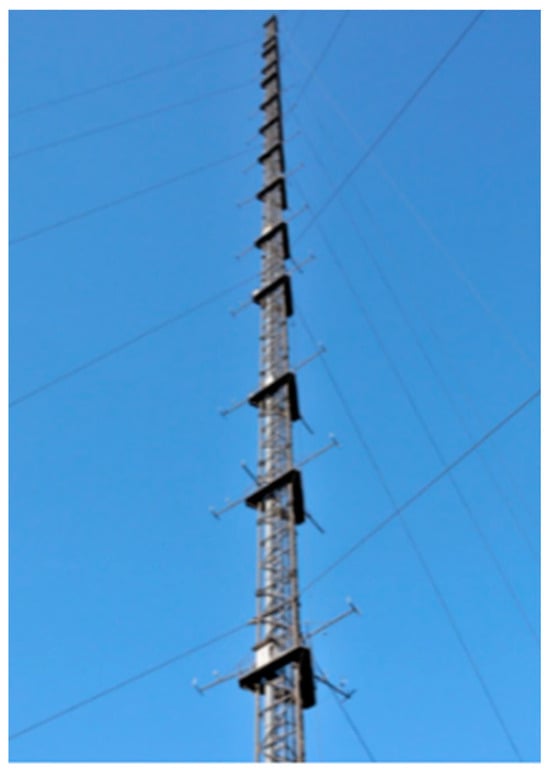 A total of 11 tri-axial ultrasonic anemometers were installed at heights of 8 m, 16 m, 32 m, 47 m, 64 m, 80 m, 140 m, 200 m, and 280 m on the tower. These anemometers are capable of simultaneously measuring three-dimensional instantaneous wind speed and temperature at a specific measurement point, with a sampling frequency of 10 Hz for all parameters. Additionally, to verify the accuracy of the measured fluctuating wind speeds, two ultrasonic anemometers at the same heights but in different directions (north and west) were installed at 32 m and 64 m, respectively, while the remaining anemometers were oriented towards the north.