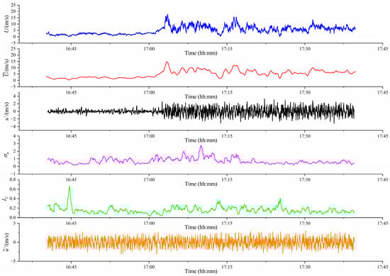 The downburst wind speed signal at a height of 47 m is decomposed using a moving average filter with a 30-s period. The variations of , , , , , over time are illustrated in Figure 3, respectively. As observed from Figure 3, both the time-varying mean wind speed and the instantaneous wind speed exhibit distinct wind speed mutation intervals. The maximum of the instantaneous horizontal wind speed occurs at 17:03, with a value of 14.49 m/s.