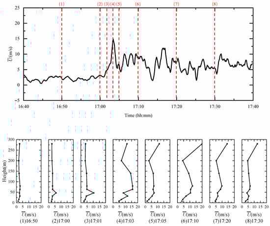 An examination of Figure 4 elucidates that at 16:50 (Moment 1), 17:00 (Moment 2), and 17:01 (Moment 3), preceding the manifestation of the downburst event, minor variations occur in wind speed with respect to height, consistently maintaining around 3.15 m/s. When the downburst occurs, specifically at 17:03 (Moment 4), a clear “nose-shaped” profile is observed, with the maximum mean wind speed appearing at a height of 80 m. During the wind speed decline phase, at Moment 5, 6, 7, and 8, as the wind speed decreases, the “nose-shaped” characteristic of the wind speed profile also weakens.