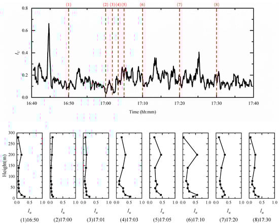 Turbulence intensity is the most important characteristic quantity that describes the characteristics of atmospheric turbulent motion. Prior to analyzing this intensity, data points deemed erroneous due to exceptionally low wind speeds, which induce significant and intense turbulence (specifically, with mean wind speeds < 5 m/s and turbulence intensities > 0.2), were excluded from consideration in this study [9]. Figure 5 presents the profiles of turbulence intensity varying with height at different time instants during the downburst event.