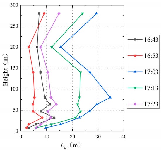 The profiles pertaining to the turbulence integral length scale related to the 10-min time interval centered with the analysis moment are depicted in Figure 6. At 16:43, 16:53, and 17:23, the turbulence integral length scale presents relatively small values and remains basically constant along the height. Notably, at 17:03, the turbulence integral length scales, representative of the vortex sizes induced by the downburst, initially increases with height, then decreases, and ultimately increases once again. During the period when the peak wind speed occurs, a pronounced “nose-shaped” profile emerges, with the apex of the nose positioned at a height of 80 m.