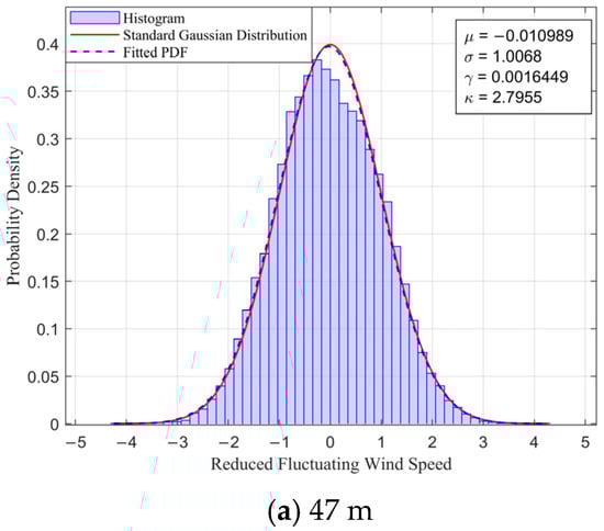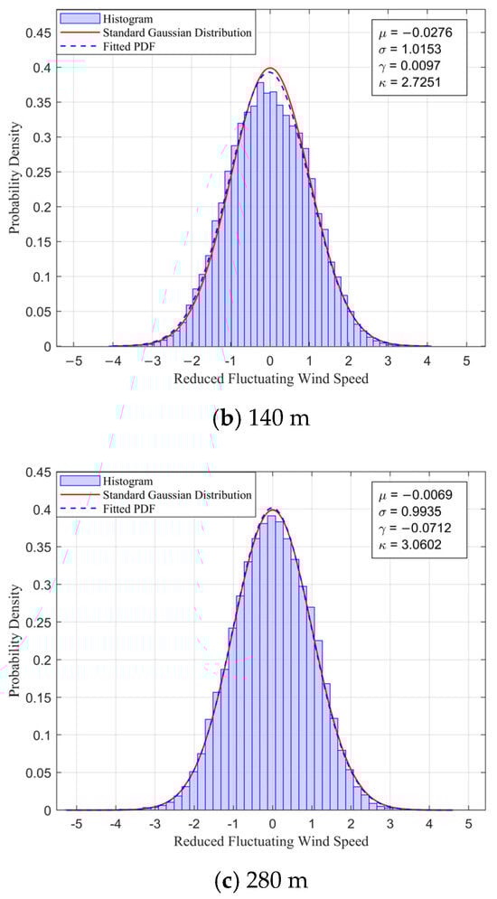 To investigate the Gaussian characteristics of reduced fluctuating wind speeds, Figure 7 presents the histograms of probability density distributions of reduced turbulent fluctuation and their fitted functions within a 10-min interval centered around the peak wind speed moment at the rough sublayer [18] (Figure 7a), the inertial sublayer (Figure 7b), and the mixed layer (Figure 7c). Additionally, the calculated statistical properties (mean , standard deviation , skewness , kurtosis ).