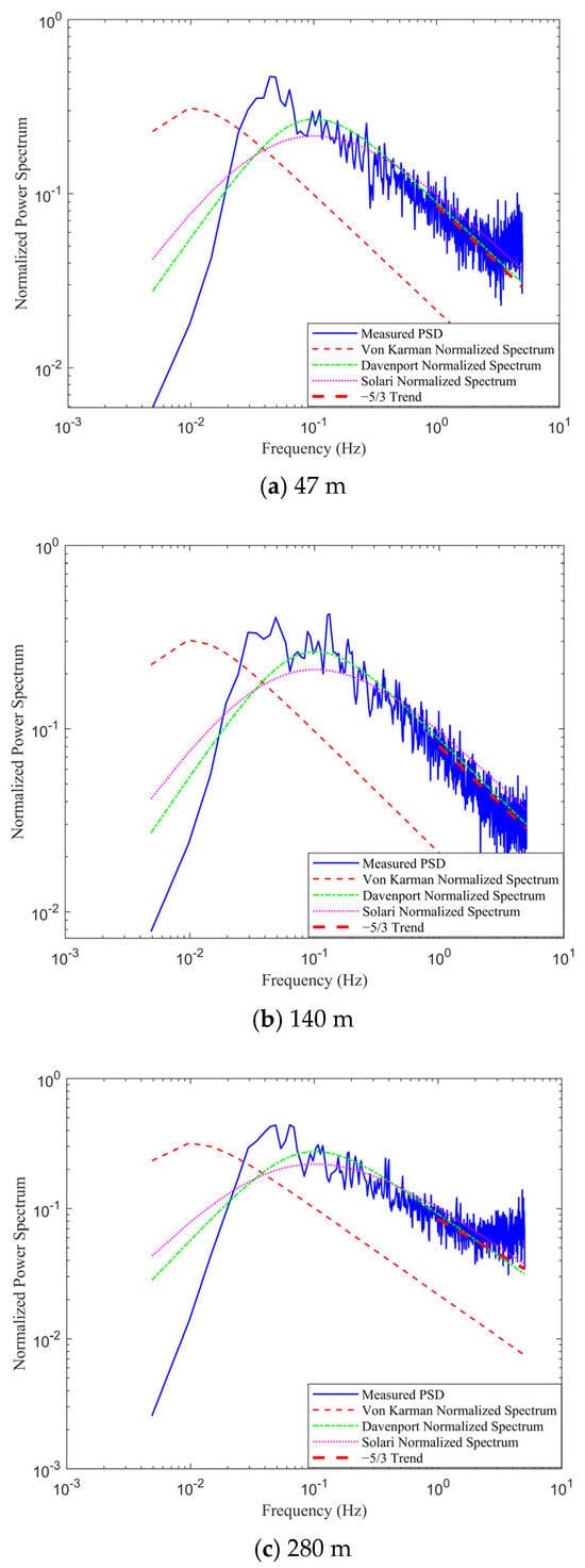 It can be observed that the downburst satisfies Kolmogorov’s “−5/3 power law” in the high-frequency range. The fitted results show poor agreement between the measured power spectrum and the Davenport spectrum [30], but better agreement with both the Von Karman spectrum [31] and the Solari spectrum [32]. The Von Karman spectrum accurately reflects the energy distribution of reduced turbulent fluctuation in both the mid- and high-frequency ranges, but it is slightly higher than the measured values in the low-frequency range. In contrast, the Solari spectrum is lower than the measured values in the mid-frequency range but higher in the low-frequency range.