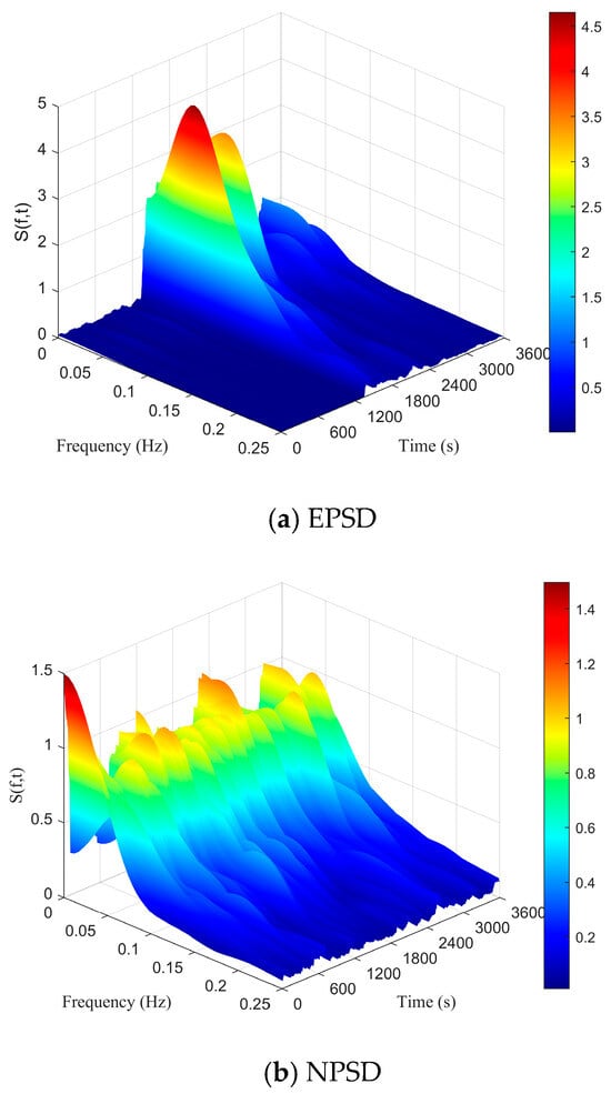 The evolutionary power spectral density (EPSD) and its normalized estimates (NPSD) of the fluctuating wind speed at the 47 m height during the downburst event are depicted in Figure 9. As shown in Figure 9a, during this event, the energy demonstrates pronounced non-stationary characteristics. Notably, the energy is predominantly concentrated within the frequency band of 0 to 0.1 Hz and during the time interval encompassing approximately 1200 to 1400 s. It is suggested that, in the context of structural design for resistance to downbursts, particular emphasis should be given to the dynamic response characteristics of structures possessing natural frequencies within this specified range. The estimated evolutionary power spectral density (EPSD) is normalized using time-varying variance, as shown in Figure 9b. It is observed that the distribution of the NPSD is non-stationary.