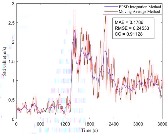 Figure 10 presents estimates of the time-varying standard deviation obtained using the Evolutionary Power Spectral Density (EPSD) integration method and the moving average method, respectively, along with the error values between the two methods (characterized by Mean Absolute Error (MAE) and Root Mean Square Error (RMSE)). Comparative analysis reveals that the MAE and RMSE of the two methods are approximately 0.17 and 0.25, respectively, and the correlation coefficient (CC) between the two methods is 0.91. This indicates that the results estimated by the two methods are relatively consistent and exhibit a strong positive correlation. Furthermore, the time-varying standard deviation obtained by the EPSD integration method is smoother, which validates the feasibility of employing the EPSD integration method for modeling downburst wind fields and calculating structural responses.