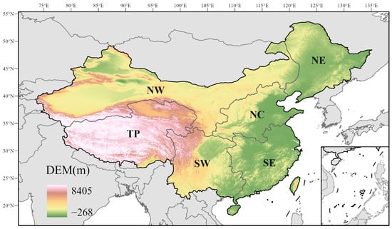 Study area: sub-regions including North China (NC), Southwest (SW), Southeast (SE), Northeast (NE), Northwest (NW) China and the Tibetan Plateau (TP).