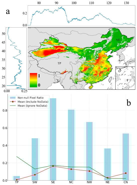 Average HHI (areas where no heatwave occurred were masked) (a), Zonal HHI, and Non-null pixel ratio (b).