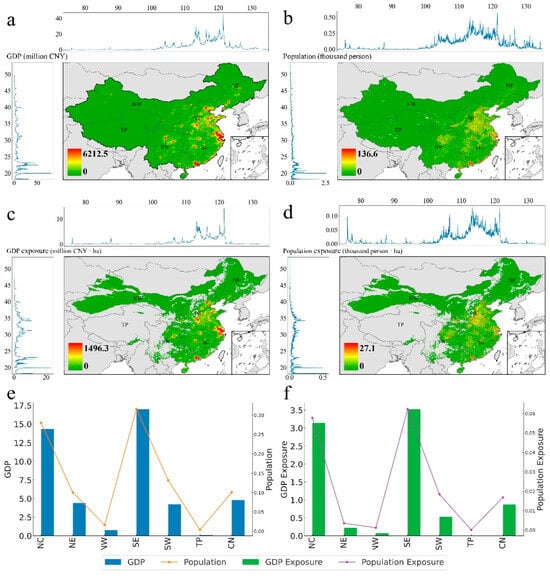 Spatial distribution of Gross Domestic Product (GDP) (million CNY) (a), population (thousand person) (b), GDP exposure (million CNY·ha) (c), population exposure (thousand person·ha) (d), zonal mean value of GDP and population (e), and zonal mean value of GDP exposure and population exposure (f).