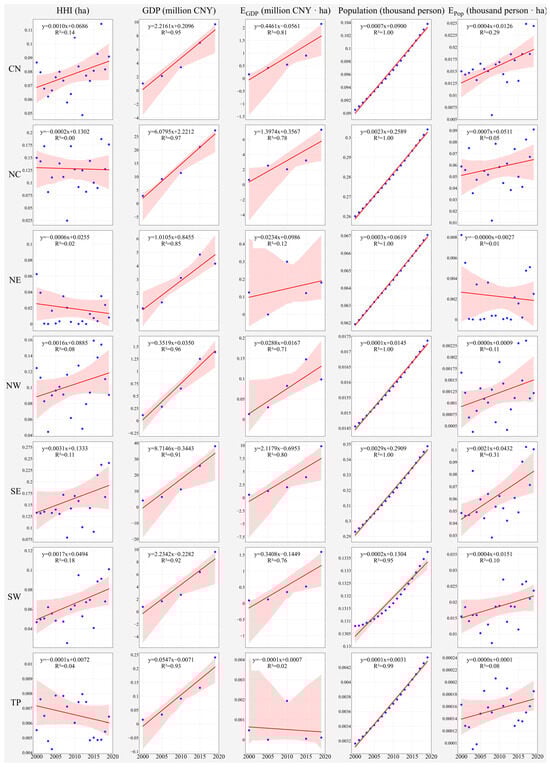 Temporal variations in annual average HHI (ha), GDP (million CNY), EGDP (million CNY·ha), Population (thousand person), EPop (thousand person·ha) for different regions. EGDP and EPop represent heatwave exposure of GDP and Population. Observed data are depicted as dots, the fitted model is represented by a line, and the confidence interval is illustrated by the shadows.