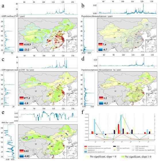 Slope and significance of Gross Domestic Product (GDP) (million CNY/year) (a), population (thousand person/year) (b), GDP exposure (million CNY·ha/year) (c), population exposure (thousand person·ha/year) (d), HHI (ha/year) (e), and zonal mean value of indices (f).