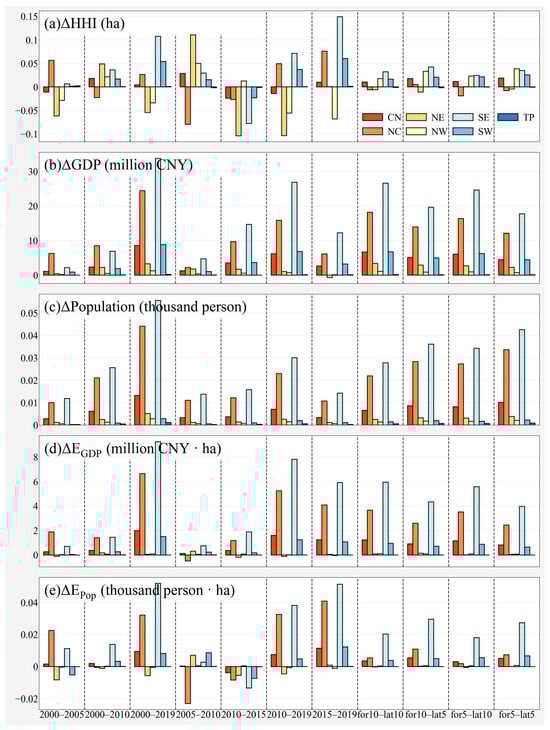 We analyzed changes for different Phase I and Phase II combinations (11 groups in total) separately. We displayed in Figure 6, where we found that from Phase I to Phase II, the magnitude of change in the mean values of different former and latter years is smaller than that of the 2000–2019 period for almost all variables and regions, but in terms of change in the mean values, it can be seen that over different time periods, the regions of heatwave socioeconomic exposure and its impact factor all change positively over time. The maximum values of the changes of all variables occur in the SE region for 2015–2019 (Figure 6a) and 2000–2019 (Figure 6b–e). It is worth mentioning that the SE region, as one of the most economically active regions in China, is highly exposed to the heatwave hazard [46,47,48]. The increase in exposure in SE amounted to at least 8 million CNY·ha, and at least 40 person·ha each grid, respectively.