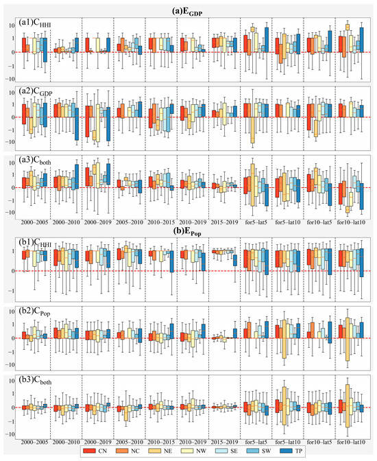 In this study, we systematically analyzed climate and socioeconomic contributions to heatwave exposure from 2000 to 2019. Figure 7 presents box plots illustrating variations in contribution rates for GDP exposure (Figure 7a) and population exposure (Figure 7b). Each panel depicts different subsets of factors: climate (Figure 7(a1,b1)), socioeconomic (Figure 7(a2,b2)), and their combined effect (Figure 7(a3,b3)).