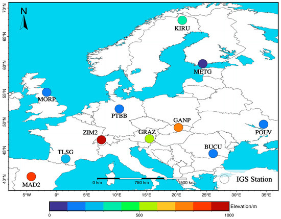 The study area is defined as the region in Europe that lies between 40° N and 70° N latitude and between 5° E and 35° E longitude. To train the model, we utilized the ZTD time series from 11 International GNSS Service (IGS) stations located within this region. The selected IGS stations are KIRU, METG, POLV, BUCU, GRAZ, GANP, PTBB, ZIM2, TLSG, MAD2 and MORP. Figure 1 illustrates the distribution of these IGS stations, while Table 1 provides specific information about each of them.
