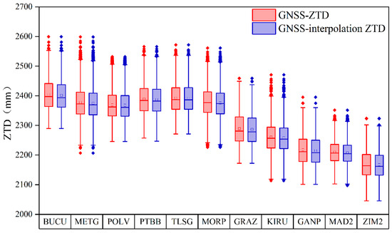 Comparison of the box plots of ZTD before and after interpolation for each IGS station used in this study. The line in the middle of the boxes represents the mean level of the data. In contrast, the upper and lower edges of the boxes correspond to the upper and lower quartiles, respectively, indicating the variability of the data. Points outside the boxes represent outliers in the data.