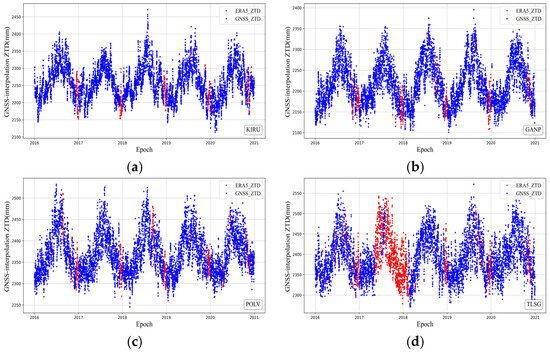 GNSS-interpolation ZTD from 2016 to 2020 for the selected IGS stations in this study. Panels (a), (b), (c), and (d) represent the stations KIRU, GANP, POLV and TLSG, respectively.