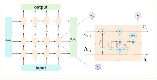 The structure of the LSTM model is shown in Figure 4, in which represents the state of the LSTM memory cell, which is transmitted across time steps and serves to preserve the long-term memory of the network. denotes the forget gate, denotes the input gate, and denotes the output gate. The mathematical formulas are as follows: