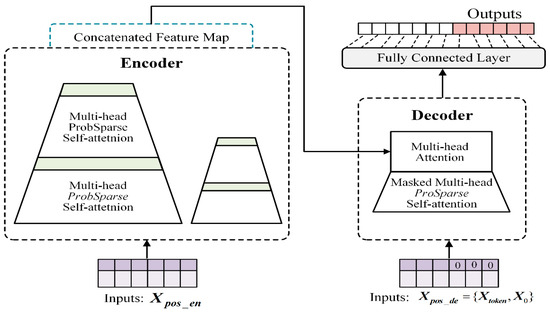 The structure of Informer is shown in Figure 5, which is mainly composed of two parts: an encoder and a decoder. The encoder’s primary role is to transform the input data into intermediate features, while the decoder generates the forecast sequence based on these features produced by the encoder. Initially, the encoder employs a Prob-Sparse Self-attention mechanism combined with a feed-forward neural network to process the input data and extract key feature information. Following this, the decoder works to reconstruct the output data from the intermediate features. It produces final features by integrating the Multiple Self-attention mechanism, the Mask Self-attention mechanism, and another feed-forward neural network. The resultant features are then mapped to the final prediction outcomes via a fully connected layer. In the decoder, the input comprises both the hidden intermediate features generated by the encoder and the original input vectors. To prevent the model from relying on past information, the values intended for prediction are set to zero. This strategy allows the model to concentrate on forecasting future locations effectively.
