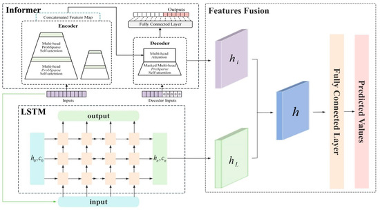 The model is implemented using parallel learning with two branches: LSTM and Informer. Initially, the data is separately input into both the Informer and LSTM models. The Informer utilizes its strong capability in modeling long-term dependencies to extract global features. It employs the ProbSparse Self-attention Mechanism to capture the long-term trends in the sequence, compressing these features through a Self-attention distilling mechanism that ultimately generates the global feature in the decoder. Meanwhile, LSTM leverages its memory effect to extract short-term dependencies and dynamic changes in the data. It retains useful information through three gating units and generating . Subsequently, the model stacks and fuses and to integrate the feature representations from both the Informer and LSTM to create a unified feature representation, denoted as h, for the Informer–LSTM Hybrid Prediction Model. Finally, a fully connected layer maps these features to produce the final prediction results. The process of feature fusion is illustrated in Expressions (14) and (15):