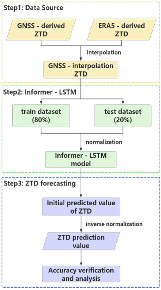 We initially utilized the GNSS source ERA5-derived ZTD to interpolate GNSS-derived ZTD, resulting in what we called GNSS-interpolation ZTD. Building on this, we developed the Informer–LSTM Hybrid ZTD Prediction model. This model was then applied to forecast ZTD variations at the 11 IGS stations in Europe in 2020.