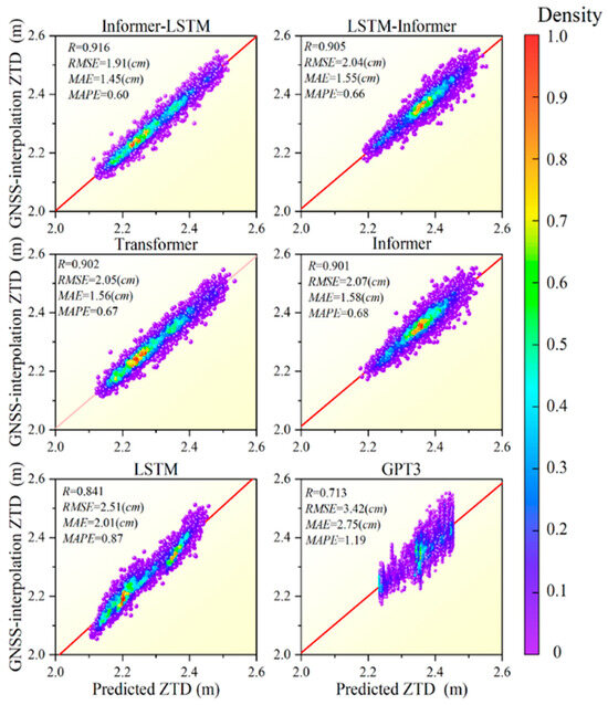 Comparison of ZTD prediction accuracy of different models. The figure uses colors to indicate the density of data points. It mainly shows the distribution of each model’s predicted and true values on a two-dimensional plane.