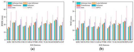 In this study, we conducted ZTD prediction experiments at 11 IGS stations in Europe, using data from 2016 to 2019 as the training set to predict ZTD for 2020. We utilized the GNSS-interpolation ZTD data from 2020 for accuracy validation. We compared our approach with other models, including the LSTM–Informer based on the serial ensemble learning model, popular machine learning models (Informer, Transformer, and LSTM models) and the GPT3 empirical model to verify the superiority of our model in ZTD prediction modeling. In this section, Informer–LSTM refers to the Informer–LSTM Hybrid Prediction Model proposed in this study, while LSTM–Informer is the comparison model based on a serial ensemble learning strategy. Each comparison model performs ZTD prediction under the same experimental conditions, including identical dataset division. Both models utilize data from 2016 to 2019 for training and validation using 2020 data, ensuring consistency in the data format and preprocessing methods. This setup allows for an objective comparison of accuracy between the method presented in this paper and the comparison models in the context of ZTD long-term series prediction.