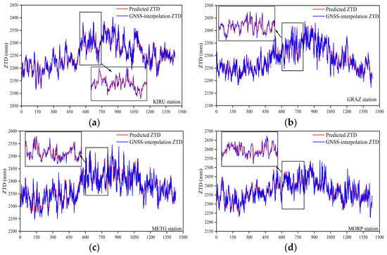Figure 10 shows the prediction effect of this paper’s model at the different locations of the stations. We chose the KIRU and GRAZ stations with higher prediction accuracy and the METG and MORP stations with lower accuracy for demonstration. Through comparison, it can be found that this paper’s model fits the ZTD time series better, not only successfully capturing the long-term trend and cyclic changes of ZTD but also performs well in fitting the local dynamics, which further verifies that the parallel ensemble learning strategy of this model gives full play to the respective advantages of the Informer model and the LSTM model.