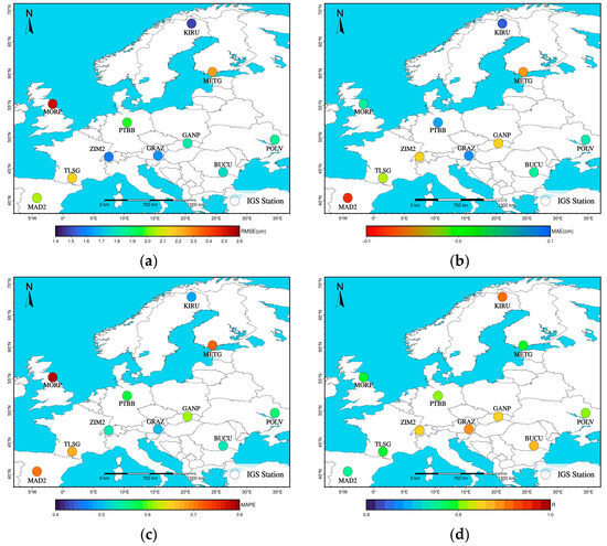 To further analyze the variations in accuracy of the Informer–LSTM Hybrid Prediction Model proposed in this study, we examined its global spatial distribution. Figure 11 illustrates the overall distribution of accuracy metrics for the Informer–LSTM Hybrid Prediction model. Our spatial distribution analysis of the RMSE reveals that prediction accuracy is relatively low at the MORP, METG, and TLSG stations. In contrast, the IGS stations in inland areas demonstrate significantly higher prediction accuracy than coastal regions. We speculate that this phenomenon may be attributed to the higher water vapor content at coastal stations, which increases the impact of ZWD on ZTD, complicating the model’s ability to learn the characteristics of ZTD. Additionally, we observed that KIRU exhibited the highest prediction accuracy, with a correlation coefficient R approaching 0.957. However, even some inland stations that were less affected by water vapor did not achieve ideal prediction accuracy. This leads us to believe that latitude may also play a role in influencing the prediction accuracy of the stations.