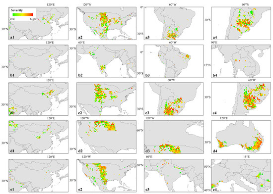 Impact of drought on crop yields in major food-producing countries ((a1–a4): maize; (b1–b4): rice; (c1–c4): soybean; (d1–d4): spring wheat; (e1–e4): winter wheat).