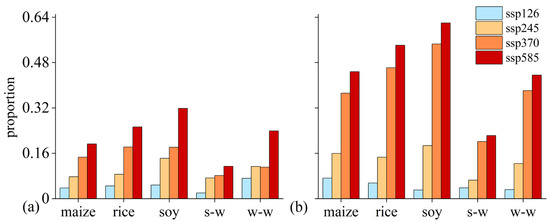Drought trends during crop growth cycle under different future scenarios ((a): 2017–2064; (b): 2017–2100; soy: soybean; s-w: spring wheat; w-w: winter wheat).