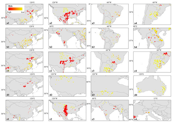 Drought-induced yield loss risks for major food-producing countries under different future scenarios ((a1–a4): maize; (b1–b4): rice; (c1–c4): soybean; (d1–d4): spring wheat; (e1–e4): winter wheat).