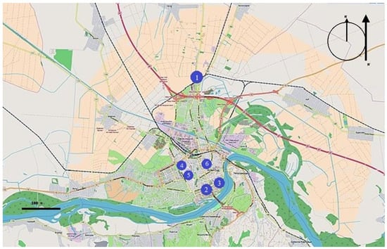 The network of stations collecting data on meteorological parameters and air pollution within the territory of Novi Sad. Legend: 1—meteorological station (45°20′ N, 19°51′ E); 2,3—UB air pollution stations (45°14′ N, 19°50′ E and 45°25′ N, 19°85′ E); 4,5,6—UT air pollution stations (45°15′ N, 19°49′ E, 45°24′ N, 19°81′ E, and 45°25′ N, 19°83′ E).