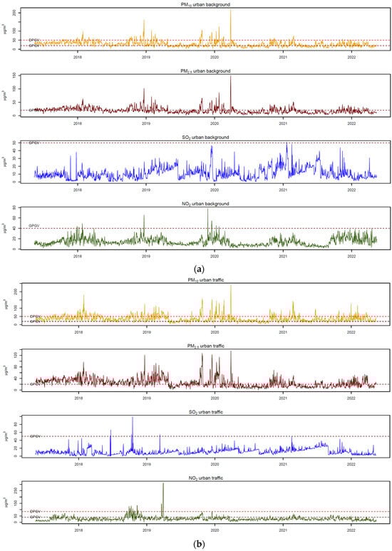 A time series of the average daily concentrations of selected air pollutants (PM10, PM2.5, SO2, and NO2) from the urban background environment (a) and urban traffic environment (b). Legend: the figure includes two lines: DPGV, represented by a red dashed line, which signifies the daily recommended concentrations of environmental air pollutants as outlined in Directive 2008/50/EC and the legal acts of the Republic of Serbia; and GPGV, represented by a dark red dashed line, which indicates the annual recommended concentrations of environmental air pollutants as specified in Directive 2008/50/EC and the legal acts of the Republic of Serbia.