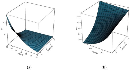 For the examination of the association between exposure to study predictors (selected air pollutants) and various study criteria (mortality, use of mechanical ventilation, and duration of current AECOPD hospitalization), distributed lag non-linear models (DLNMs) were used [17]. This type of analysis allows for the existence of non-linear relationships between predictors and criteria, as well as relationships between lag effects and criteria. In cases where the distribution of dependent variables was binomial, such as examining the impact of predictors on whether there were patients requiring mechanical ventilation or whether there were fatal outcomes of patients admitted on a particular day, binary logistic regression was used in the analysis. On the other hand, a quasi-Poisson (regression) model was used to investigate the impact of predictors on the duration of hospitalization.