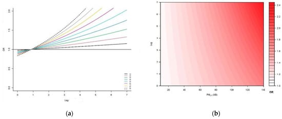 Lag effects of SO2(UT) and PM2.5(UB) on the occurrence of AECOPD hospitalizations requiring the use of mechanical ventilation. Legend: (a) SO2(UT) single-predictor models—in lag0, the influence of the predictor on the criterion is “protective” for all concentrations, but it is not statistically significant. In lag1, there is no correlation, and in subsequent lags, the effect grows rapidly. Statistically significant effects of all predictor concentrations on the higher probability of using mechanical ventilation are present in lag4 and lag5; (b) PM2.5(UB) multi-predictor models—on this contour plot, it can be seen that all predictor concentrations in all lags have an OR that is above 1 (red color), which indicates an increased chance of the outcome occurring. The effects are more pronounced at higher concentrations and in later lags. A statistically significant elevated effect is present only in lag4.