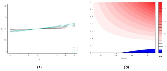 Lag effects of SO2 on the RR for the prolonged duration of AECOPD hospitalizations (single-predictor models). Legend: (a) SO2(UB)—the effect of all predictor levels (different concentrations are marked by curves of different colors) is in the initial lags (lag0-lag3) as “protective” (RR less than 1, which would indicate a reduced duration of hospitalization), but these effects are not statistically significant. In lag3, the RR value for all predictor levels is 1, after which the RR value increases, more slowly at lower concentrations, and a stronger relationship exists at higher concentrations. The RR values for lag5-lag7 are statistically significant (exposure to all predictor concentrations prolongs the duration of hospitalization in these lags); (b) SO2(UT)—contour graph indicates that in lag0, the effect of increasing concentrations tends to be “protective” and more so at higher concentrations of SO2(UT), but nowhere is this effect statistically significant. At later lags, the RR value increases, more so at higher concentrations, and it becomes statistically significant (prolonged duration of AECOPD hospitalization) after lag3 for all concentrations (greater effect at higher concentrations).
