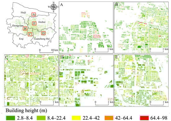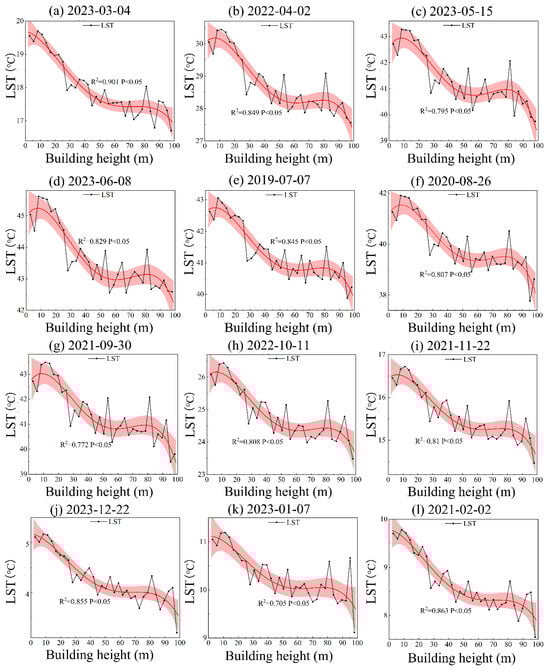- There are two peaks in the relationship between building height and LST. The LST rises more slowly at heights below 10 m. In the range of 50–80 m, the curve gradually flattens out, and the increase in height has little effect on the LST image. After more than 80 m, the LST drops abruptly, and the higher the height, the more significant the cooling effect of the building’s shadow.