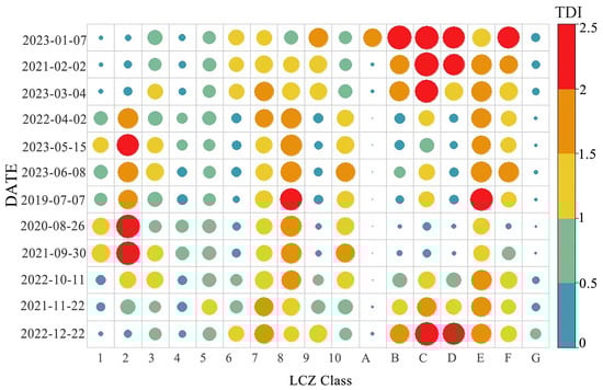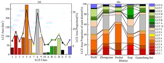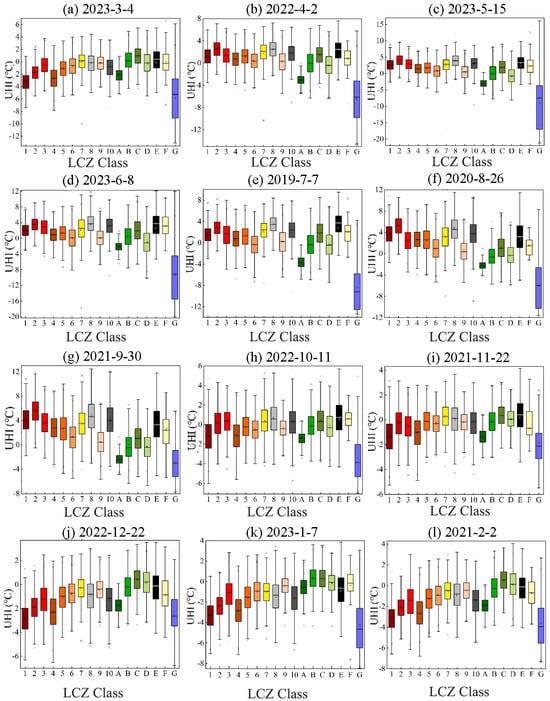 - Among all constructed landscape types, low-rise structures have a clear warming effect. LCZ 8 and LCZ 10 have the highest UHI throughout the year. The UHI effect of popular building types (LCZ 1–6) increased in the spring, summer, and fall and subsequently reduced as building height decreased. The UHI effect of LCZ 1 and LCZ 4 was consistent with that of LCZs 1–6 for structures with the same density. For middle- and low-rise buildings, LCZ 2>LCZ 5 and LCZ 3>LCZ 6. In natural landscapes, the water body (LCZ G) has the lowest UHI, followed by dense forest (LCZ A), and hardened ground (LCZ E) has the highest UHI.